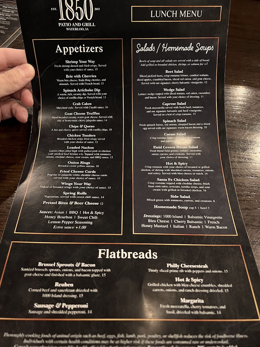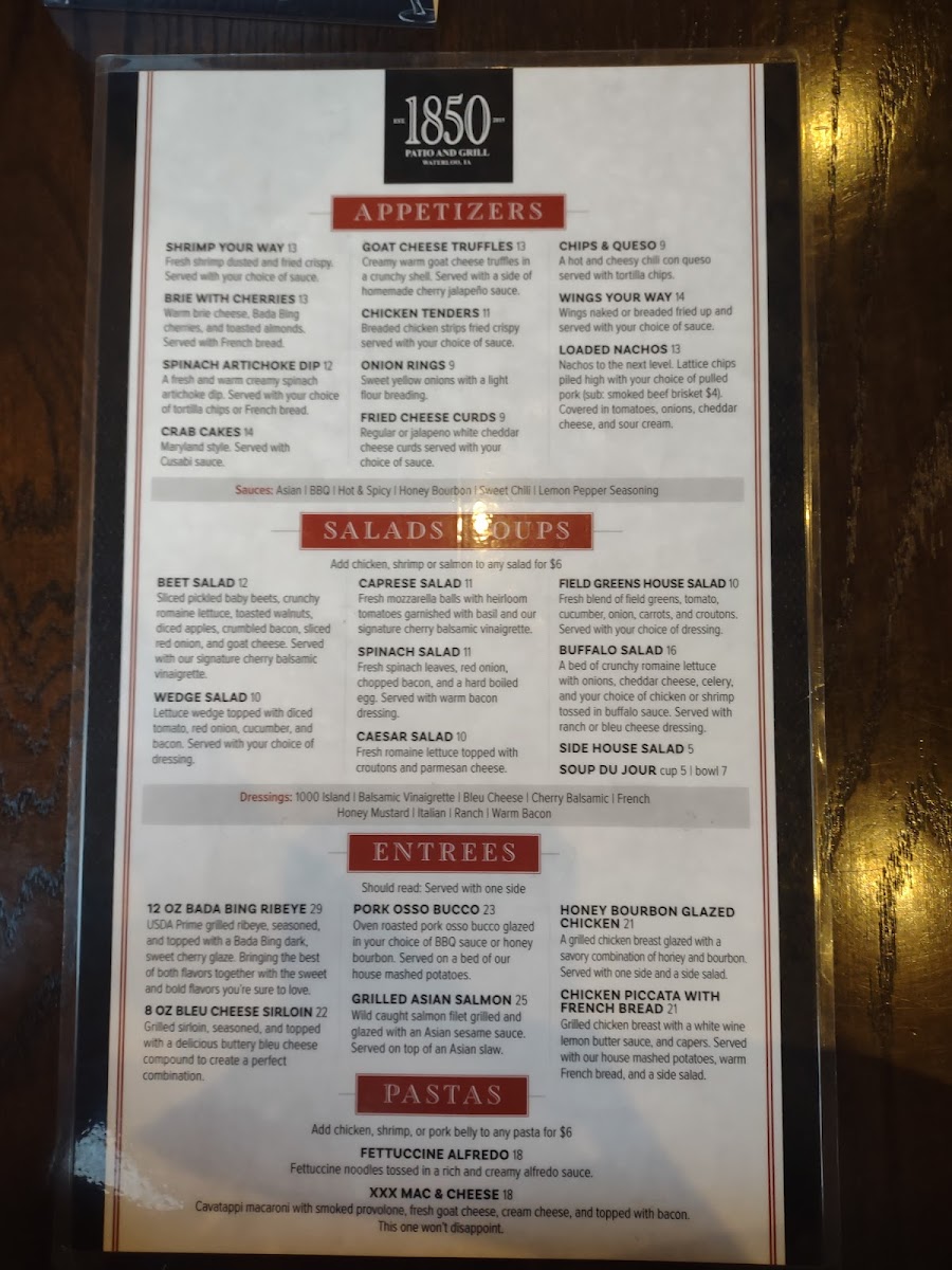 Welcome to 1850 Patio Grill, a hidden gem located in Waterloo, IA, where culinary creativity thrives on a diverse menu that defies the norm. Nestled at 1850 W Ridgeway Ave, this restaurant invites patrons to savor unique offerings beyond the typical meat-and-potato fare. Their dishes embrace bold flavors and fresh ingredients.